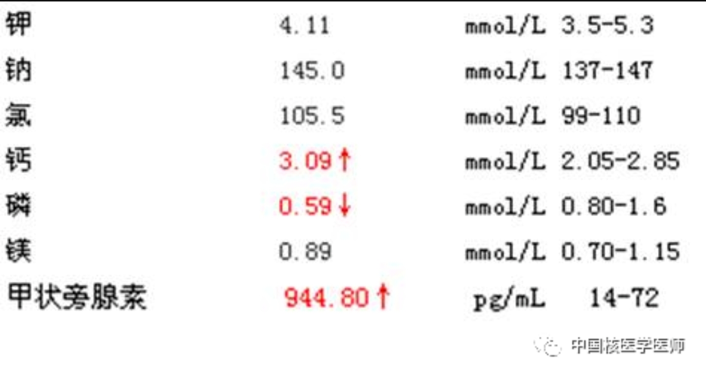 如果您有上述癥狀,首先建議您采血化驗一下血離子及甲狀旁腺激素(parathormone,PTH),當化驗結(jié)果呈現(xiàn)類似下面的情況(血鈣升高,血磷降低,甲狀旁腺激素升高),那么您可能患上了原發(fā)性甲狀旁腺功能亢進癥。
