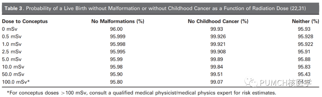 醫(yī)療照射對妊娠的影響我們在開電離輻射的檢查申請時,HIS系統(tǒng)都會提示要填寫女性患者的妊娠情況。胚胎或胎兒作為年齡尚為負數(shù)的人類前體,對電離輻射是最敏感的,較大的照射劑量可能會造成胎死、畸形、神經(jīng)系統(tǒng)發(fā)育不良、早發(fā)腫瘤等不良結(jié)局。在非必要的情況下,盡量不給妊娠患者開具有電離輻射的檢查項目。電離輻射對胎兒的生物學(xué)效應(yīng)包括細胞死亡和未修復(fù)或異常修復(fù)的DNA損傷。細胞死亡為確定性效應(yīng),有一定輻射劑量閾值,通常認為超過100-200mGy的劑量會發(fā)生細胞死亡,可造成胎死、中樞神經(jīng)系統(tǒng)發(fā)育異常、白內(nèi)障、發(fā)育遲緩、畸形等等,而低于該閾值則不會發(fā)生。DNA修復(fù)損傷為隨機效應(yīng),發(fā)生幾率隨劑量增加而增長,沒有確定的閾值,可能造成腫瘤的發(fā)生。電離輻射對胎兒的影響主要取決于孕期和輻射劑量,在孕期的不同階段,輻射對胚胎或胎兒的風(fēng)險有所不同:①0-2周末(胚種期,受精至著床),此階段可認為是“全或無”的效應(yīng),細胞損傷通常會被修復(fù),也可能直接造成胚種無法著床或死亡;②3周初-8周末(胚胎期,主要器官發(fā)育階段),超過100-200mGy的輻射劑量有增加畸形幾率的風(fēng)險;③9周-出生(胎兒期),包含8-25周中樞神經(jīng)系統(tǒng)主要發(fā)育期,其中8-12周中樞神經(jīng)系統(tǒng)對輻射最為敏感,100mGy以上的輻射劑量可能引起智力下降,1Gy的輻射可造成智障,而16周以后就不這么敏感了。在早發(fā)腫瘤方面,一項meta分析總結(jié)了胎兒期未接受過照射的背景人群早發(fā)(0-15歲)實體或血液系統(tǒng)腫瘤的幾率約為0.2%-0.3%,而胎兒期照射劑量100mGy的人群早發(fā)腫瘤發(fā)生率約0.3%-0.4%。下表列出了胚胎/胎兒未接受與接受不同輻射劑量時,畸形和早發(fā)腫瘤的發(fā)生率,可以看出,100mSv以下的吸收劑量對胎兒畸形和早發(fā)腫瘤的發(fā)生幾乎無影響。
