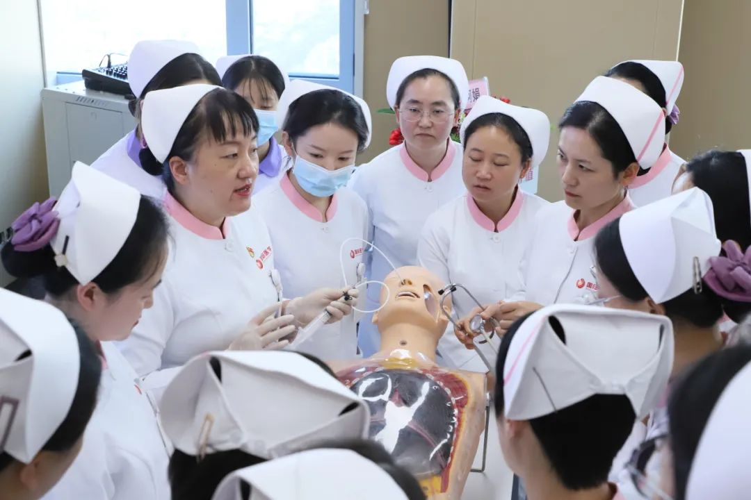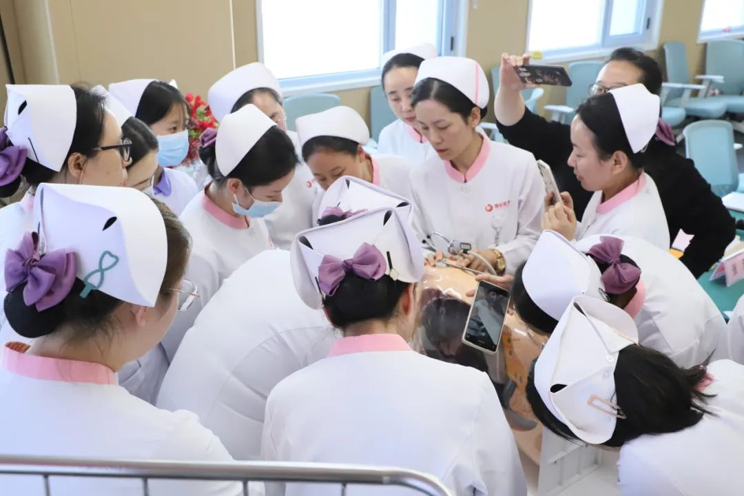 鼻腸管置管技術工作坊由普外科楊阿娟護士長、神經外科申冬青護士長進行操作演示、講解標準化的置管流程與方法,并就鼻腸管置管過程中的技巧、要點、難點、常見問題及注意事項進行詳細的回答,分組練習階段,護士們熱情高漲,積極參與實踐練習。