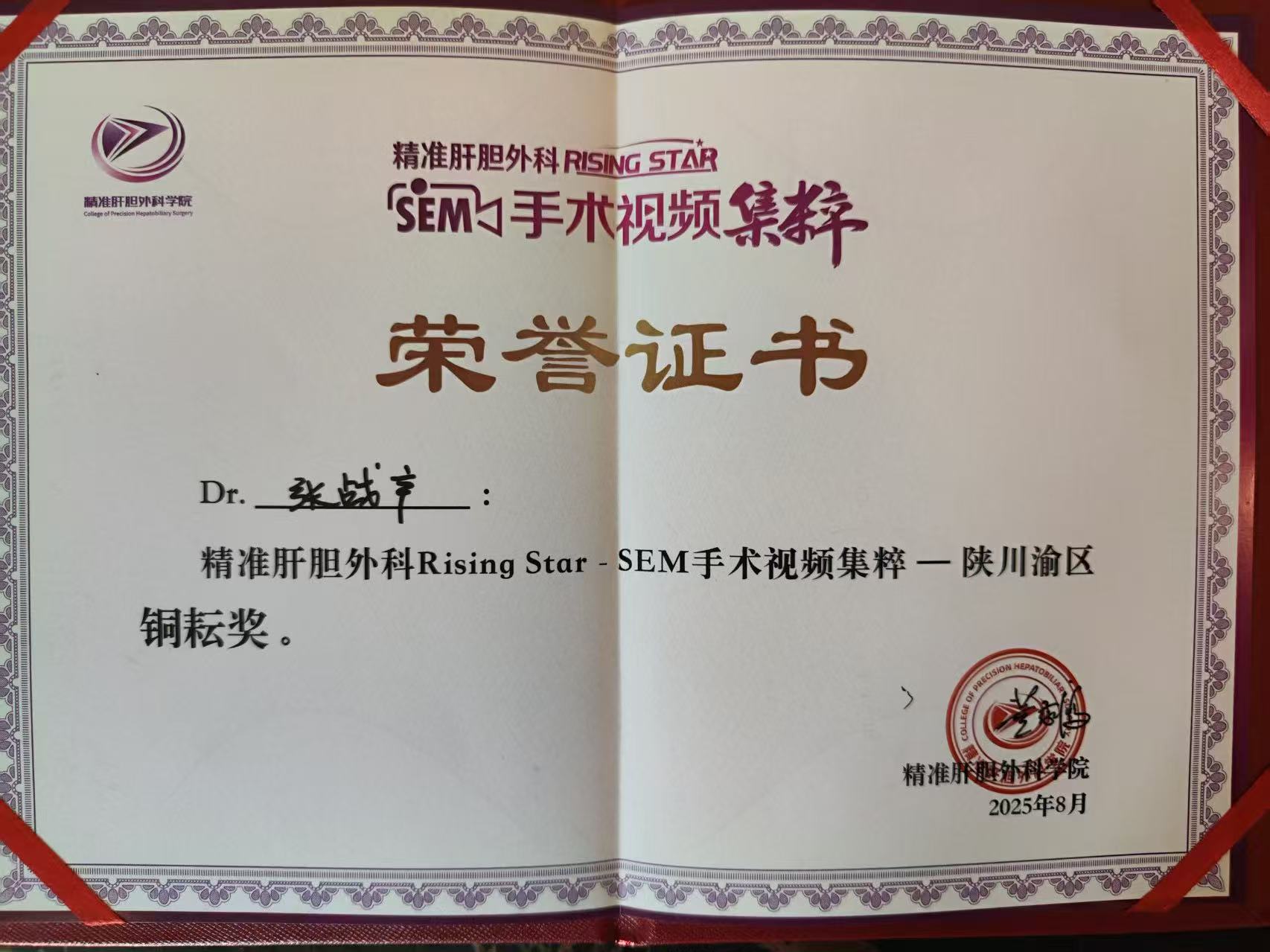 在清華長庚醫(yī)院董家鴻院士牽頭的精準肝膽外科Rising Star-SEM手術視頻比賽中,普外科張戰(zhàn)產醫(yī)生經過前期西北賽區(qū)層層選拔,進入陜川渝三地決賽(三地眾多醫(yī)院中僅9名選手參賽),在決賽中獲得銅耕獎。