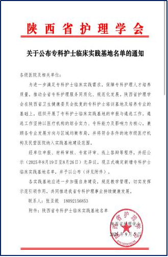 2025年9月5日,陜西省護(hù)理學(xué)會發(fā)布《關(guān)于公布陜西省專科護(hù)士臨床實踐基地名單的通知》,我院共有6個專科基地獲批,分別為:消化內(nèi)科、腫瘤科、中醫(yī)科、精神心理科、糖尿病專業(yè)、血液凈化。