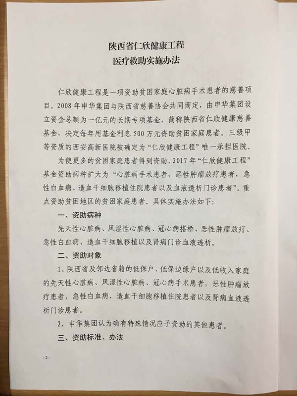 西安高新醫院是陜西省慈善協會“仁欣健康工程”指定醫院。自2008年西安高新醫院與陜西省慈善協會聯合開展“仁欣健康工程”救助貧困家庭心臟病患者項目以來,共救助貧困家庭心臟病患者3300余人次,救助金額2122萬余元。此項活動使貧困家庭心臟病患者得到了救助,避免了家庭悲劇,為社會和諧穩定和家庭幸福做出了貢獻,獲得了省內外各市縣(區)慈善協會、民政局及廣大患者的贊揚與支持,同時也得到了社會各界的認同和贊揚。