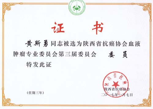 2017年1月7日,陜西省抗癌協會血液腫瘤專業委員會換屆選舉在西安華山國際酒店舉行,西安高新醫院血液科黃斯勇副主任當選為陜西省抗癌協會血液腫瘤專業委員會委員。