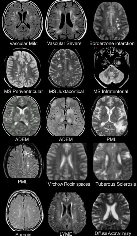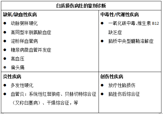 白質(zhì)損傷病灶需要鑒別診斷的疾病種類非常多。在正常的衰老過程中,可見白質(zhì)損傷病灶,但大多數(shù)白質(zhì)損傷病灶都是獲得性的,由缺血缺氧引起的。其中,最常見的炎性疾病是多發(fā)性硬化,最常見的病毒感染性疾病是進行性多灶性白質(zhì)腦病(PML)和HIV。遺傳性疾病通常表現(xiàn)為對稱性病灶,因此必須與中毒性疾病相鑒別。