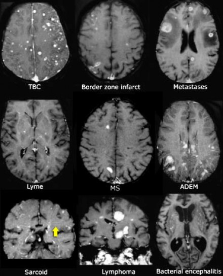 MRI成像要點:2-3毫米大小病灶,與MS的病灶類似。患者有皮膚紅斑和流感樣疾病。其他特征包括:脊髓高信號,CN7(神經(jīng)根入腦干處)增強。