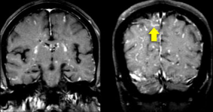 該患者的另一個典型特征是線性增強病灶(上圖中黃色箭頭所示),這是由于沿著血管周圍間隙發(fā)生炎癥病變造成的,也是另一種形式的軟腦膜增強。