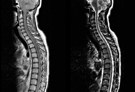 該患者的脊髓是正常的。血管炎或缺血性疾病患者的脊髓通常是正常的,而90%以上的MS患者的脊髓MRI成像都會發(fā)現(xiàn)異常。如果很難區(qū)分老年患者的白質(zhì)損傷病灶是血管源性的還是MS,則對該患者行MR成像將非常有助于鑒別診斷。