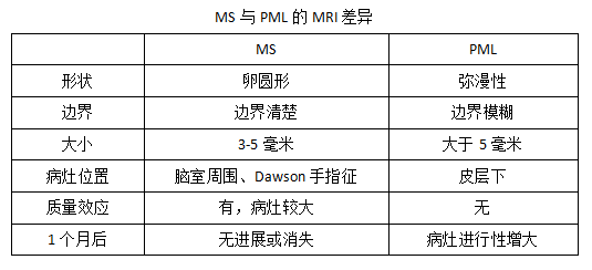進行性MS與那他珠單克隆抗體相關(guān)性PML之間的鑒別診斷比較難。下表是MRI成像中兩者的差異。