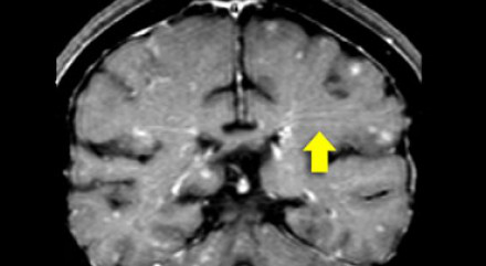 上圖是該患者冠狀位釓增強T1加權(quán)成像圖像。請仔細觀察上圖,我們可以看到在基底節(jié)中有點狀增強病灶,這種病灶特征可見于肉樣瘤,也可見于系統(tǒng)性紅斑狼瘡或其他血管炎性疾病。