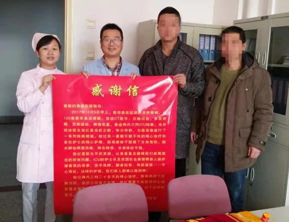 隨后家屬送來的慰問信是這樣描述我們醫(yī)護(hù)人員的“在住院期間,張紅星醫(yī)師不厭其煩,認(rèn)真解答家屬提出的所有問題,護(hù)士們給予患者翻身叩背,溫水擦浴,導(dǎo)尿通便……