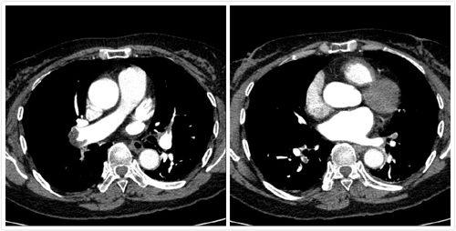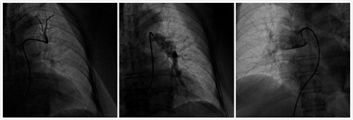 患者,女性,62歲,曾從事油漆工工作,工作有長時間站立、下蹲特點。因活動后胸悶、氣短、呼吸困難3日,加重1日主訴入院,入院后經(jīng)心內(nèi)二科張曉鋒主任、呂強副主任醫(yī)師仔細(xì)分析患者癥狀及心電圖、血氣分析后,肺動脈CTA檢查迅速明確診斷,確定該患者介入手術(shù)適應(yīng)證,預(yù)計會有較好的療效。在充分與患者及家屬溝通,同意肺動脈造影及抽栓、碎栓、藥物溶栓手術(shù)治療。呂強副主任醫(yī)師、張曉鋒主任醫(yī)師、潘立棟醫(yī)師、邵玉玲主管護師、車曉偉技師組成的手術(shù)小組在經(jīng)歷一個多小時緊張而有條不紊的操作后,順利完成了肺動脈血栓抽栓、碎栓、藥物溶栓搶救。患者術(shù)后取得了立竿見影的效果,胸悶、氣短、呼吸困難明顯減輕,次日復(fù)查動脈血氣分析氧分壓明顯改善,目前患者恢復(fù)良好。