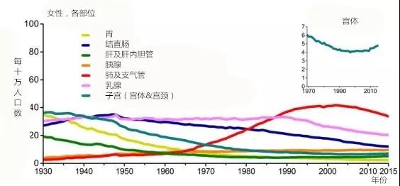 女性癌癥罹患率仍保持穩定,因為肺癌、結直腸癌的下降被新增的乳腺癌、宮體癌、甲狀腺癌、黑色素瘤所抵消。2005 年至 2014 年乳腺癌每年發病率增長 0.3%~0.4%。肺癌發病率大幅下降(得益于控煙)。