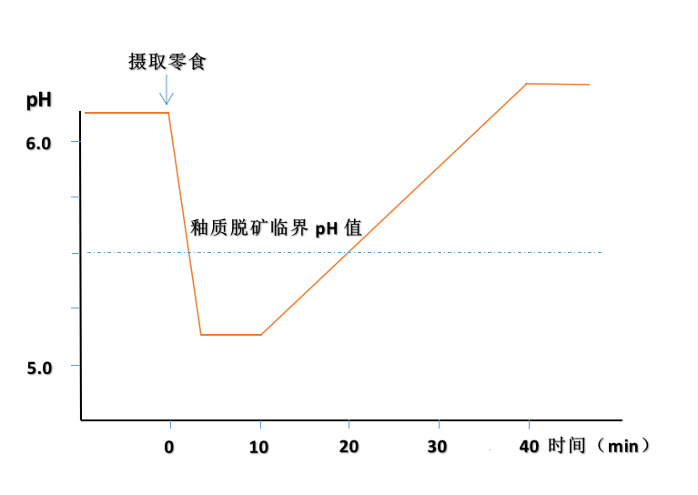上圖表示進(jìn)食后10分鐘內(nèi)口腔PH值降到最低,如果停止進(jìn)食,因?yàn)橥僖旱臎_刷作用,PH值會(huì)逐漸升高
