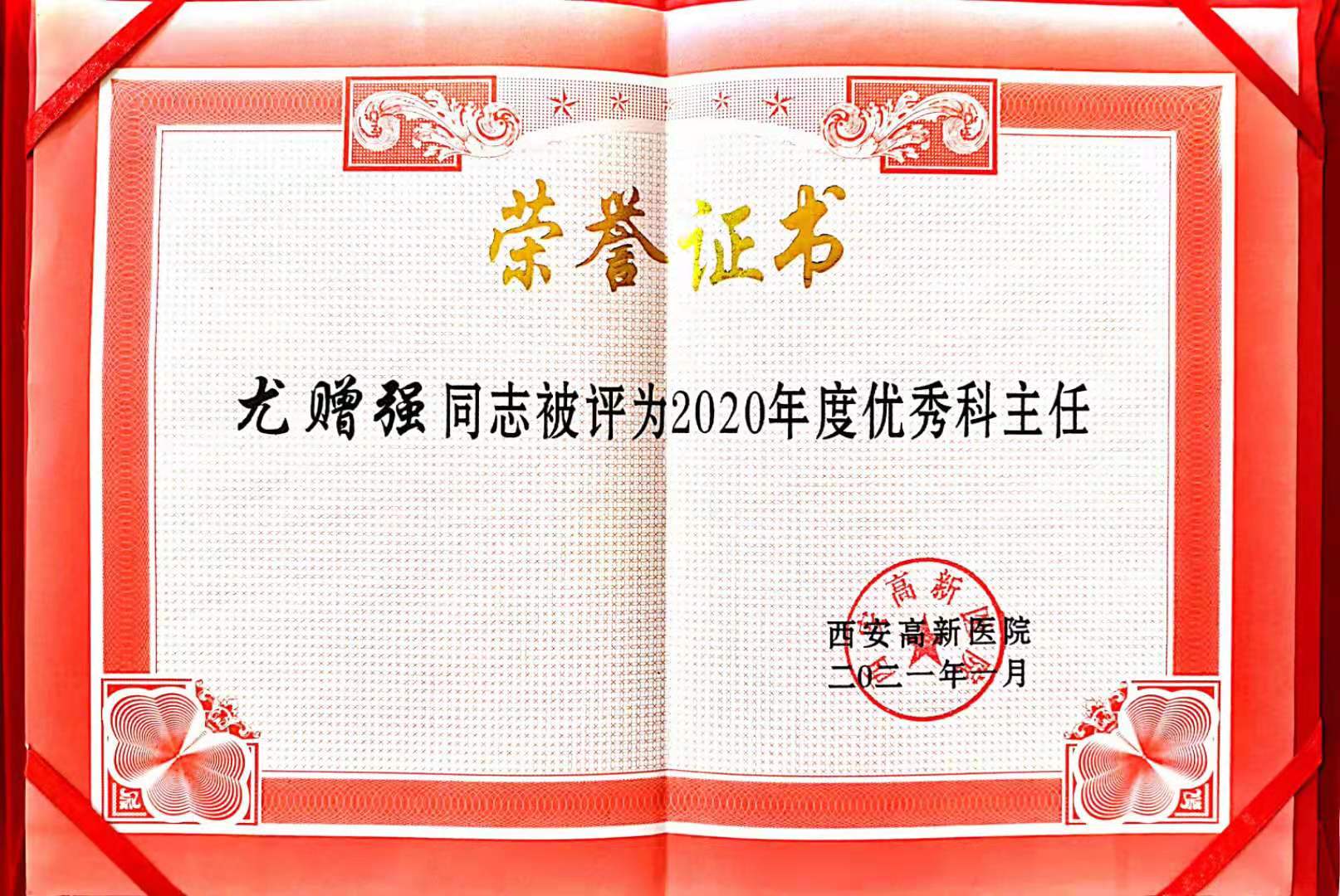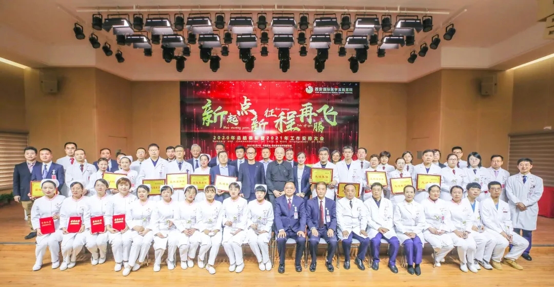 西安國際醫學高新醫院2020年總結表彰大會及2021年工作安排大會于2021年2月4日(農歷臘月二十三)在高新醫院19樓國際會議廳隆重舉行,本次會議以“新起點、新征程、再騰飛”為主題,總結了2020年全院工作亮點,表彰了2020年的做出特殊和巨大貢獻的集體和個人,體檢科尤贈強主任獲得2020年優秀科主任稱號,常務副院長呂良山先生頒發了榮譽證書和獎金。這也是繼2019年尤主任獲得“集團先進管理者”稱號以來連續兩年獲得的個人榮譽。