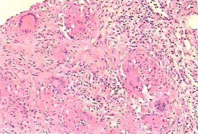 結(jié)核球又名結(jié)核瘤,是與周圍組織境界分明的球形干酪樣壞死灶。鏡下觀,結(jié)核瘤的中心部有程度不等的干酪樣壞死灶,有的已發(fā)生鈣化,周圍可見有Langhans巨細(xì)胞及類上皮細(xì)胞的結(jié)核性肉芽組織。