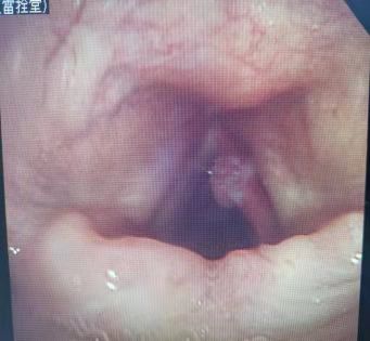 一定時(shí)機(jī)。經(jīng)過(guò)充分討論后決定在全麻、氣管插管下,經(jīng)氣管鏡下介入方法完成局部手術(shù)切除治療。隨后在我科內(nèi)鏡室嚴(yán)密生命體征監(jiān)測(cè)及呼吸機(jī)支持條件下,在氣管插管后進(jìn)入電子支氣管鏡,針對(duì)右側(cè)聲帶腫物準(zhǔn)確快速清除,并局部創(chuàng)面的凍融治療。整個(gè)操作過(guò)程時(shí)間時(shí)間短、出血少,患者蘇醒快,氧合及生命體征穩(wěn)定。此次麻醉科、
