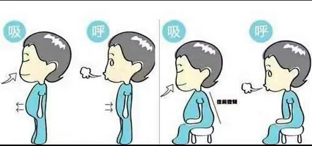 呼吸訓練:腹式呼吸:慢吸慢呼,吸氣時鼓肚子、呼氣時癟肚子。 吹蠟燭式呼吸:慢吸快呼。