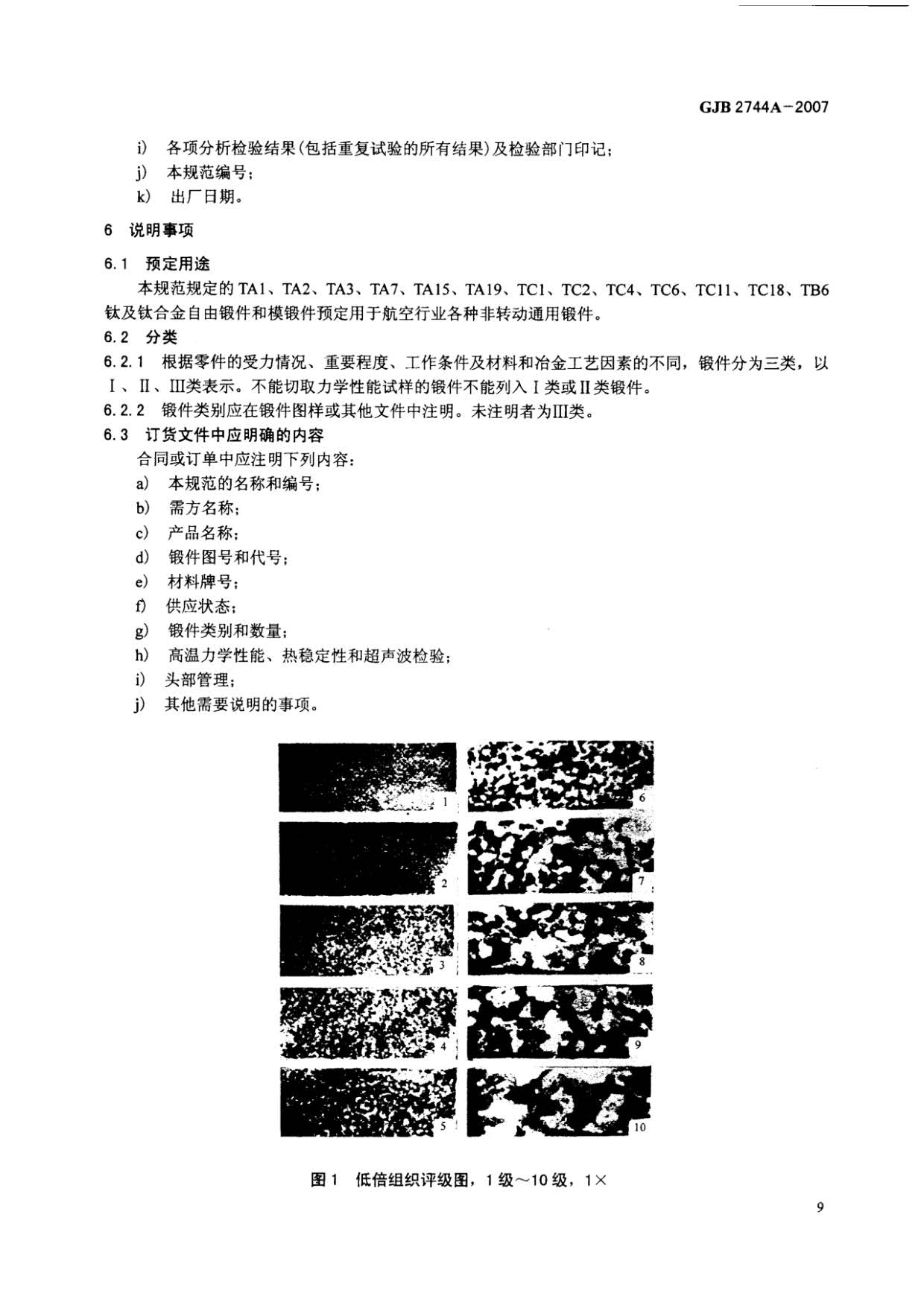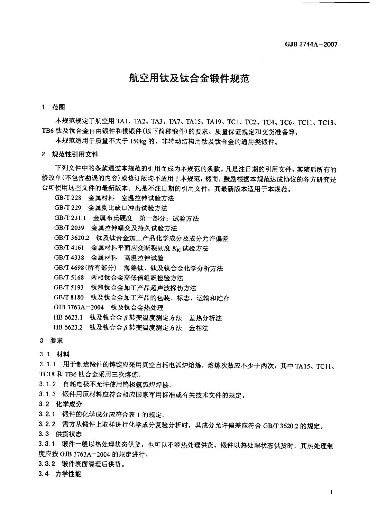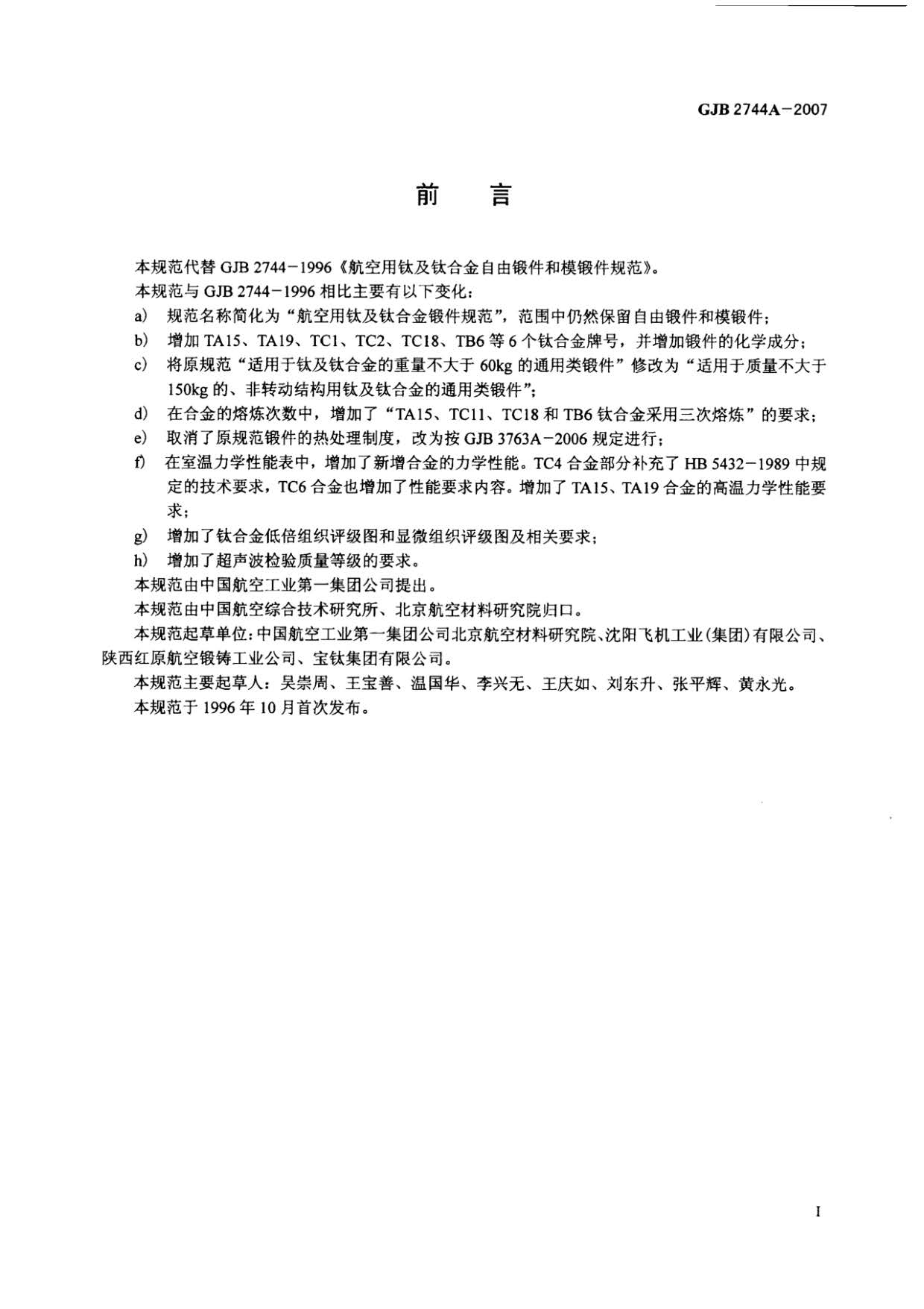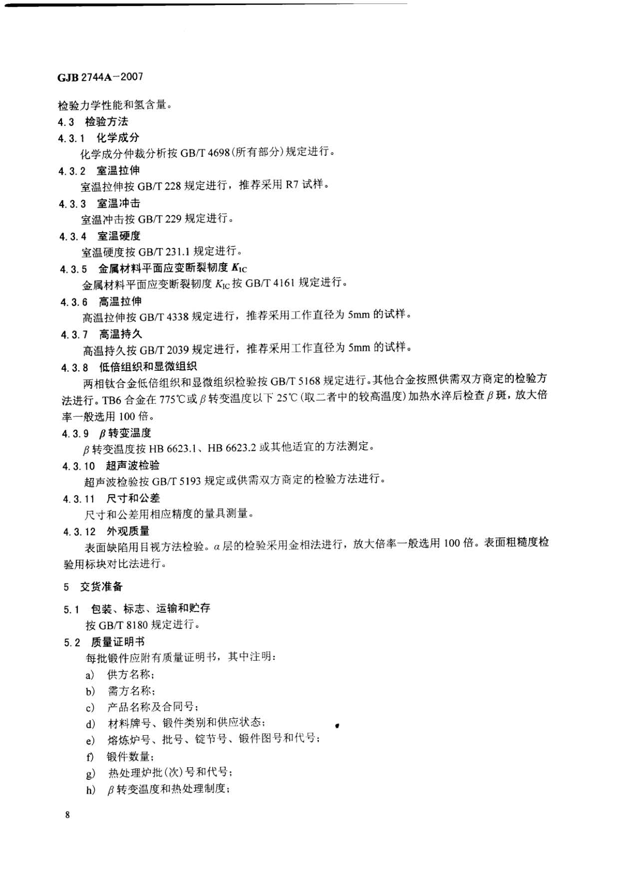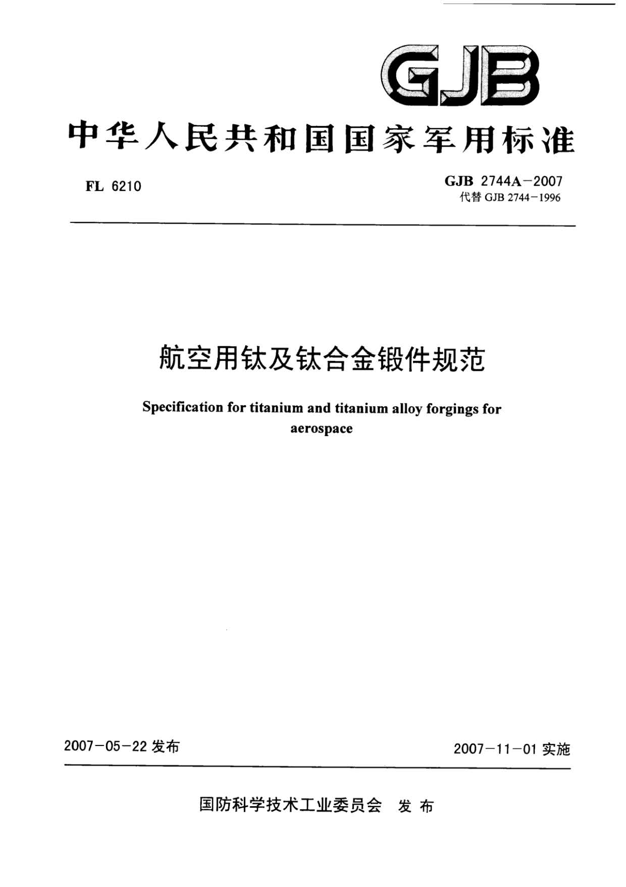 航空用鈦及鈦合金鍛件規范 GJB 2744A-2007,規定了TA1、TA2、TA3、TA7、TA15、TA19、TC1、TC2、TC4、TC6、TC11、TC18、TB6鈦及鈦合金自由鍛件和模鍛件(以下簡稱鍛件)的要求,質量保證規定和交貨準備等。