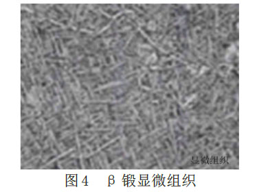 圖4為β鍛顯微組織圖,該顯微組織可以反映相變點的熱變形量,經過研究證明,其在某個固定溫度可以導致鍛造變形,從而使顯微結構發生轉變。